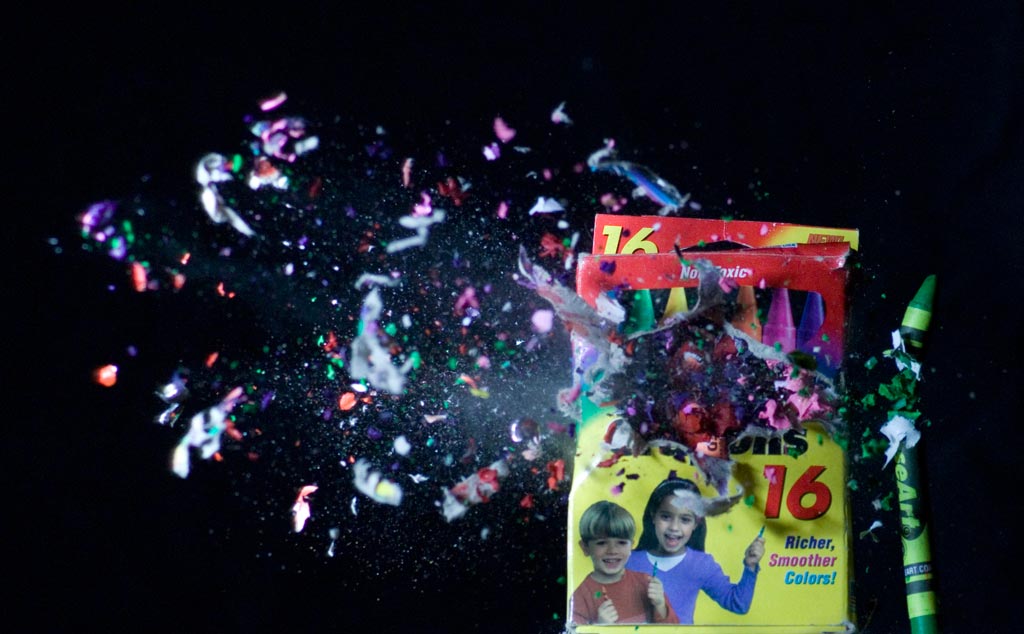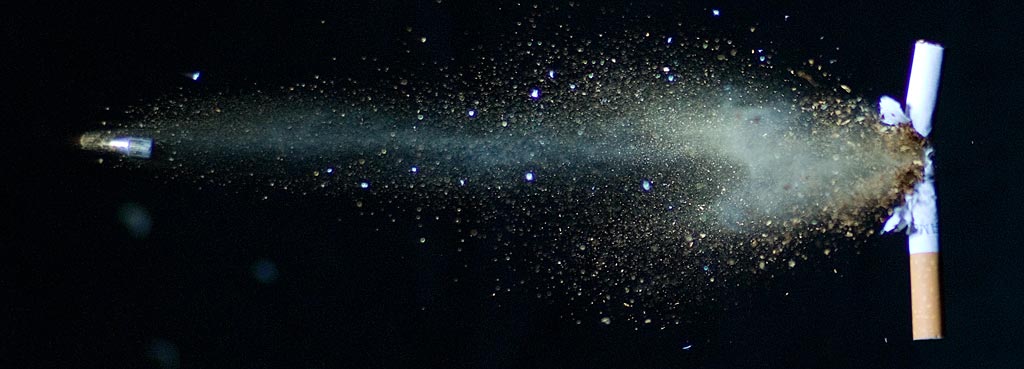 Microsecond Flash photography is a method of still photography that uses short duration lighting of a subject to capture a high speed event. This image is of a 22 caliber bullet travelling through a cigarette. The camera was on the bulb setting and the flash was triggered by the sound of the gun blast. The intensity of the light and the short duration stopped this bullet in flight.