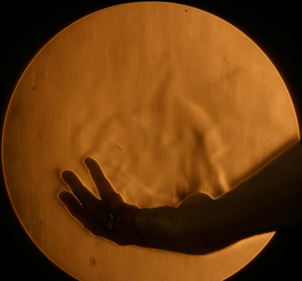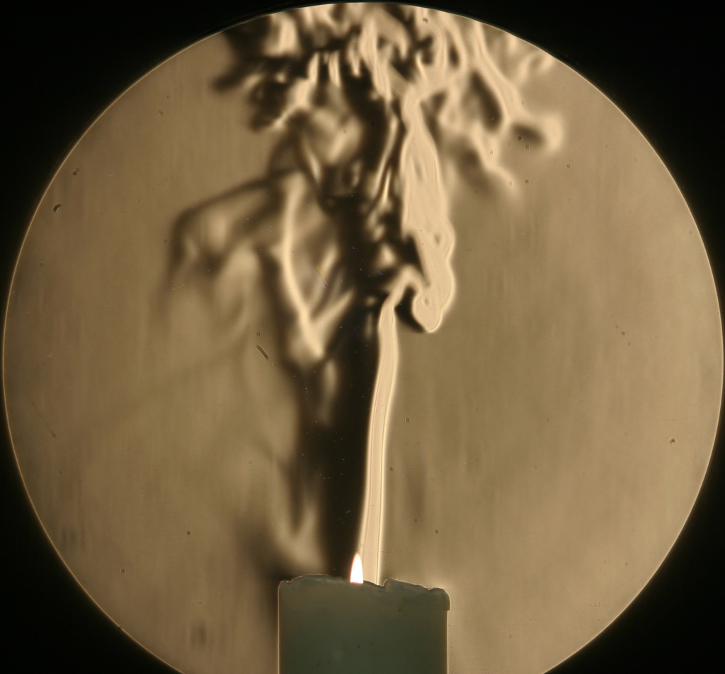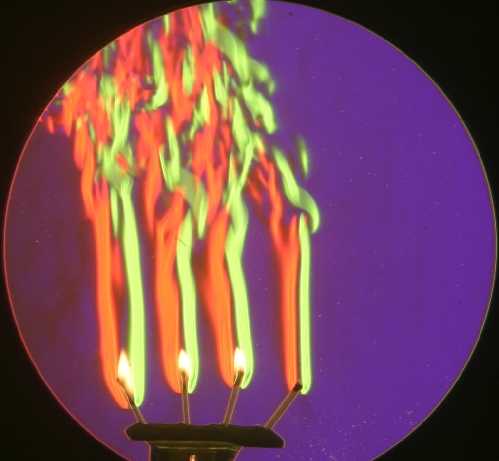 Schlieren Photography is an event which utilizes the refraction of light allowing density changes in a fluid to be visually amplified. This method is similar to Shadowgraph except it uses mirrors to retro reflect collimated light to illuminate the subject. These changes can then be imaged to test the properties of objects and their interaction with their environment. Show here with the use of the candles, demonstrating how heat rises. The color is achieved by using a specially designed filter which has a small strip of one color with two other colors on either side.