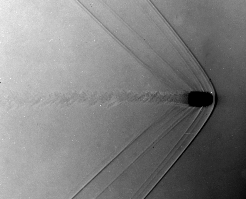 Shadowgraph Photography is a method of backlighting a subject to view changes in fluid density using a collimated light source. In this example it is captured using microsecond flash which exposed photographic emulsion while the bullet was in frame.