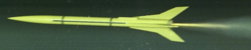 SynchoBallistic Imaging refers to a technique which is used to image ballistic trajectories both subsonic and supersonic. This method can be used with both film emulsion and digital sensor. It works by moving the capture device at the same speed and in the same direction as the subject being imaged. This image was created using a film streak camera rotated at the approximately the same velocity as the rocket travelled across the image slit. Placing measured test markers on the subject as a reference allow for the speed and characteristics of the flight to be captured. If the rocket was slower than the camera speed it would be longer on the resulting image. Similarly if the rocket was faster than the camera speed it would be smaller on the resulting image. If the rocket spun or had other tendencies during flight they would be captured on the film.